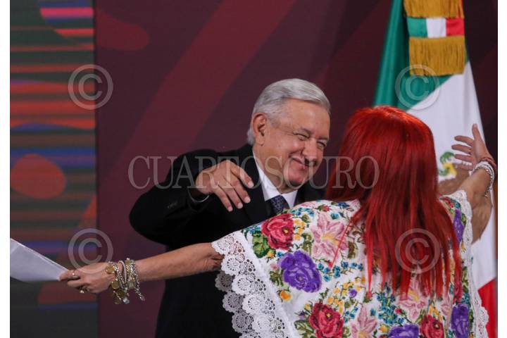 CIUDAD DE MÉXICO, 23ENERO2023.-. Andrés Manuel López Obrador, Presidente de México; Ricardo Sheffield Padilla, titular de la Procuraduría Federal del Consumidor (Profeco); Javier May Rodríguez, director general del Fondo Nacional de Fomento al Turismo (Fonatur); Antonio Gómez García, director general de Grupo Carso; Ariadna Montiel Reyes, secretaria de Bienestar; Maite Ramos Gómez, directora de Alstom México; Diego Prieto Hernández, director general del Instituto Nacional de Antropología e Historia (INAH); María Luisa Albores González, secretaria de Medio Ambiente y Recursos Naturales; Blas Andrés Núñez Jordán, jefe del Centro Coordinador de Operaciones (CCO) del Tren Maya; Luis Cresencio Sandoval González, secretario de la Defensa Nacional; y Layda Sansores San Román, gobernadora de Campeche, durante la mañanera en la que se habló de los avances del Tramo 2 del Tren Maya. FOTO: MOISÉS PABLO/CUARTOSCURO COM