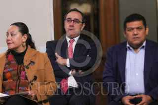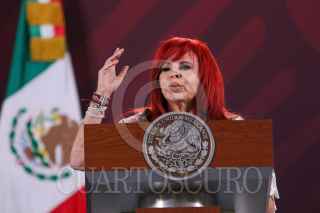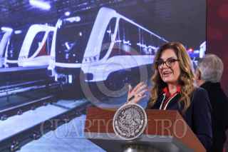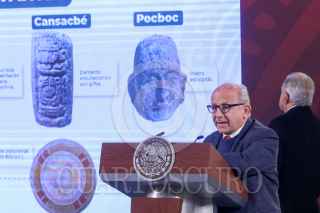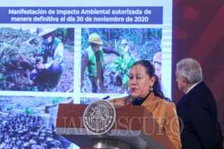 CIUDAD DE MÉXICO, 23ENERO2023.-. Andrés Manuel López Obrador, Presidente de México; Ricardo Sheffield Padilla, titular de la Procuraduría Federal del Consumidor (Profeco); Javier May Rodríguez, director general del Fondo Nacional de Fomento al Turismo (Fonatur); Antonio Gómez García, director general de Grupo Carso; Ariadna Montiel Reyes, secretaria de Bienestar; Maite Ramos Gómez, directora de Alstom México; Diego Prieto Hernández, director general del Instituto Nacional de Antropología e Historia (INAH); María Luisa Albores González, secretaria de Medio Ambiente y Recursos Naturales; Blas Andrés Núñez Jordán, jefe del Centro Coordinador de Operaciones (CCO) del Tren Maya; Luis Cresencio Sandoval González, secretario de la Defensa Nacional; y Layda Sansores San Román, gobernadora de Campeche, durante la mañanera en la que se habló de los avances del Tramo 2 del Tren Maya. FOTO: MOISÉS PABLO/CUARTOSCURO COM