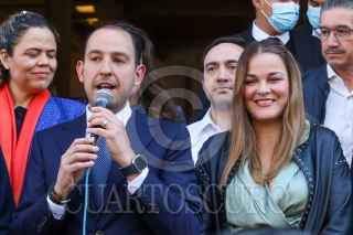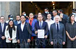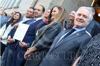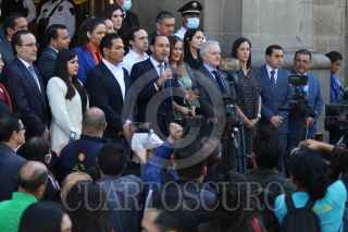 CIUDAD DE MÉXICO, 23ENERO2023.- Mario Cortés, dirigente nacional del PAN; Santiago Creel, presidente de la Cámara de Diputados; Jorge Romero, coordinador de los diputados panistas; Cecilia Patrón, secretaria general del PAN, y Lía Limón, alcaldesa de Álvaro Obregón, junto con otros compañeros de partido presentaron una acción de inconstitucionalidad contra los cambios en materia electoral que fueron aprobados por la Cámara de Diputados y promovidos por el Jefe del Ejecutivo. Los panistas ofrecieron una rueda de prensa en las escalinatas de la Suprema Corte de Justicia de la Nación pero tuvieron que apresurarla ante los abucheos de las personas que pasaban por el lugar. FOTO: MOISÉS PABLO/CUARTOSCURO.COM