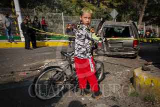 CIUDAD DE MÉXICO, 25ENERO2023.- Un niño con su bicicleta se detiene frente al acordonamiento por una volcadura de un camión de bomberos en la calle Poloni esquina con Patli de la colonia Atcaxco en la alcaldía Magdalena Contreras. FOTO: ROGELIO MORALES /CUARTOSCURO.COM