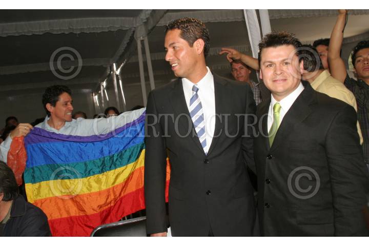 MEXICO, D.F. 16MARZO2007.- Antonio Medina y Jorge Cerpa son la primer pareja gay que firmaron la Ley de sociedad de convivencia en la delegación Iztapalapa, sus testigos fueron la escritora Sabina Berman y Emilio Alvares Icaza, presidente de la Comisión de Derechos Humanos del D.F. FOTO: NELLY SALAS/CUARTOSCURO.COM