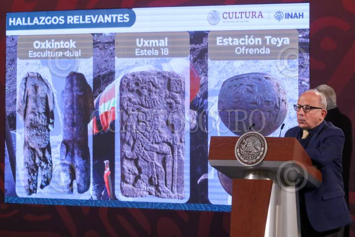 CIUDAD DE MÉXICO, 30ENERO2023.- Andrés Manuel López Obrador, Presidente de México; Mauricio Vila, gobernador de Yucatán; Manuel Bartlett, director de la CFE; Luis Cresencio Sandoval, secretario de la Defensa Nacional; Javier May, director de Fonatur; Manuel Muñozcano Castro, director general de Azvindi Ferroviario; Maite Ramos Gómez, directora de Alstom México; Ricardo Sheffield Padilla, titular de la Procuraduría Federal del Consumidor (Profeco); Blas Andrés Núñez Jordán, jefe del Centro Coordinador de Operaciones (CCO) del Tren Maya, adscrito a la Dirección General de Ingenieros de la Secretaría de la Defensa Nacional (Sedena), durante la mañanera en la que se dieron detalles del Tramo 3 del Tren Maya. FOTO: MOISÉS PABLO/CUARTOSCURO.COM
