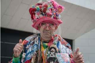 CIUDAD DE MÉXICO, 03FEBRERO2023.- Un hombre que porta una gran variedad de muñecos de peluche posa para una fotografía mientras camina por el Complejo Cultural Los Pinos. FOTO: MARIO JASSO/CUARTOSCURO.COM