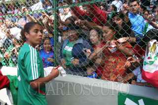TOLUCA, ESTADO DE MÉXICO, 17MARZO2007.- La mexicana Maribel Domínguez convivió con aficionados al término del encuentro que la Selección Femenil Mexicana de Futbol ganó a su similar de Japón por marcador de 2-1, pero no consiguió su pase al Mundial de China, al terminar 3-2 el marcador global. FOTO: ISAAC ESQUIVEL/CUARTOSCURO.COM