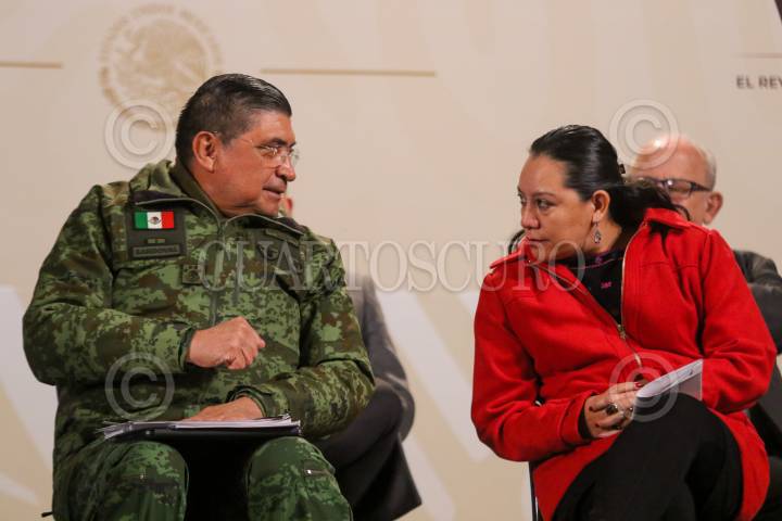 CIUDAD DE MÉXICO, 06FEBRERO2023.- Andrés Manuel López Obrador, Presidente de México; Ricardo Sheffield Padilla, titular de la Procuraduría Federal del Consumidor (Profeco); Guadalupe Phillips Margain, directora general de Empresas ICA; Javier May Rodríguez, director general del Fondo Nacional de Fomento al Turismo (Fonatur); María Luisa Albores González, secretaria de Medio Ambiente y Recursos Naturales; Diego Prieto Hernández, director general del Instituto Nacional de Antropología e Historia (INAH); Ariadna Montiel Reyes, secretaria de Bienestar; Jorge Nuño Lara, secretario de Infraestructura, Comunicaciones y Transportes; Luis Cresencio Sandoval González, secretario de la Defensa Nacional, y Blas Andrés Núñez Jordán, jefe del Centro Coordinador de Operaciones (CCO) del Tren Maya. Dirección General de Ingenieros de la Secretaría de la Defensa Nacional (Sedena), durante la mañanera en la cual se habló sobre los avances del Tramo 4 del Tren Maya, y del juicio de Genaro García Luna. FOTO: MOISÉS PABLO/CUARTOSCURO.CON