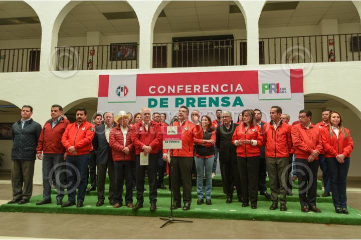 TOLUCA, ESTADO DE MÉXICO, 06FEBRERO2023.- Alejandro Moreno Cárdenas líder nacional del PRI en conferencia de prensa acompañado por Erick Sevilla Montea de Oca líder estatal del partido tricolor y ex gobernadores como Francisco Olvera de Hidalgo, Miguel Alonzo Reyes de Zacatecas, Manuel Cavazos Lerma de Tamaulipas, afirmaron el respaldo y confianza en la precandidata Alejandra del Moral a la gubernatura del Estado de México, así como que serán designados ex gobernadores priistas como delegados nacionales para la campaña de Del Moral. FOTO: CRISANTA ESPINOSA AGUILAR /CUARTOSCURO.COM