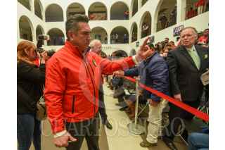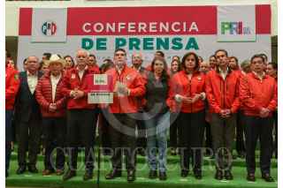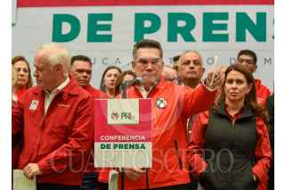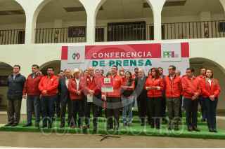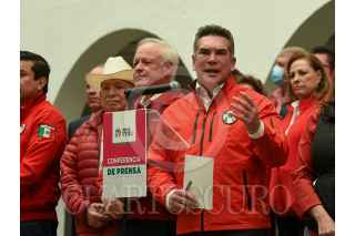 TOLUCA, ESTADO DE MÉXICO, 06FEBRERO2023.- Alejandro Moreno Cárdenas líder nacional del PRI en conferencia de prensa acompañado por Erick Sevilla Montea de Oca líder estatal del partido tricolor y ex gobernadores como Francisco Olvera de Hidalgo, Miguel Alonzo Reyes de Zacatecas, Manuel Cavazos Lerma de Tamaulipas, afirmaron el respaldo y confianza en la precandidata Alejandra del Moral a la gubernatura del Estado de México, así como que serán designados ex gobernadores priistas como delegados nacionales para la campaña de Del Moral. FOTO: CRISANTA ESPINOSA AGUILAR /CUARTOSCURO.COM