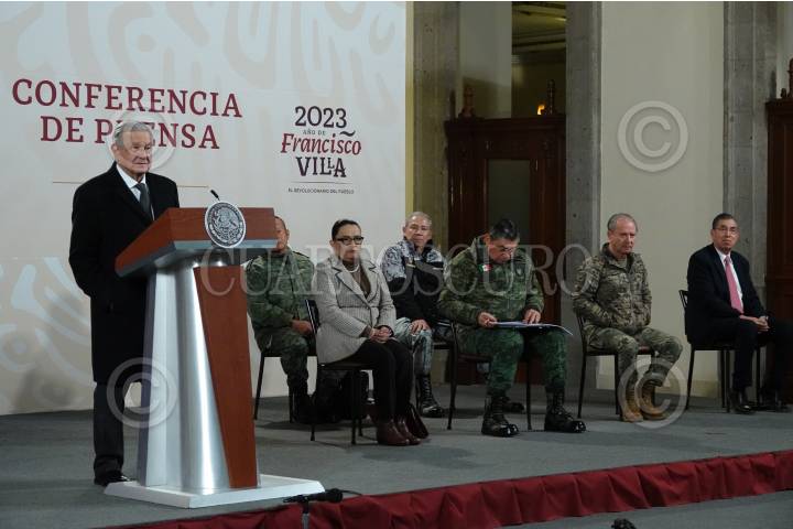 CIUDAD DE MÉXICO, 07FEBRERO2023.- Andrés Manuel López Obrador, presidente de México, en compañía del gabinete de seguridad integrado por: Rosa Icela Rodríguez, secretaria de Seguridad y Protección Ciudadana; Luis Cresencio Sandoval, secretario de la Defensa Nacional; Rafael Ojeda, secretario de Marina; Luis Rodríguez Bucio, subsecretario de Seguridad Ciudadana, y David Córdova Campos, comandante de la Guardia Nacional, presidieron la conferencia de prensa matutina para dar el informe en dicha materia. Se destacó el despliegue de efectivos en diferentes estados de la República, así como la envía de ayuda humanitaria a Turquía tras el sismo. FOTO: GALO CAÑAS/CUARTOSCURO.COM