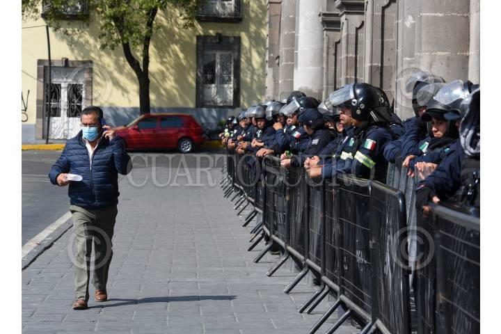 TOLUCA, ESTADO DE MÉXICO, 08FEBRERO2023.- Policías estatales y municipales de Toluca fueron desplegados en las inmediaciones de Palacio de Gobierno, Palacio municipal de Toluca y la Catedral ante el anuncio de una manifestación de feministas radicales por la tarde. FOTO: CRISANTA ESPINOSA AGUILAR /CUARTOSCURO.COM