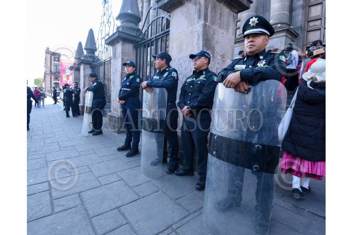 TOLUCA, ESTADO DE MÉXICO, 08FEBRERO2023.- Policías estatales y municipales de Toluca fueron desplegados en las inmediaciones de Palacio de Gobierno, Palacio municipal de Toluca y la Catedral ante el anuncio de una manifestación de feministas radicales por la tarde. FOTO: CRISANTA ESPINOSA AGUILAR /CUARTOSCURO.COM