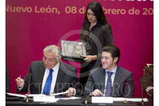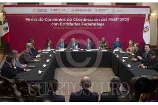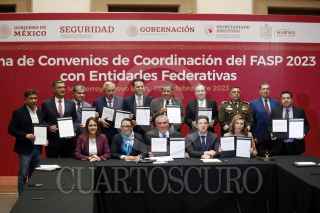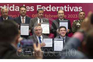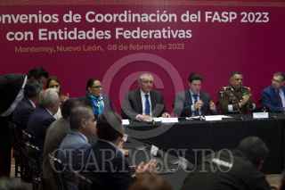 MONTERREY, NUEVO LEÓN, 08FEBRERO2023.- El Secretario de gobernación; Adán Augusto López, acudió al Palacio de Gobierno de Nuevo León a la Firma de Convenio de Coordinación del Fondo de Aportaciones para la Seguridad Pública (FASP) con diez gobernadores y representantes de la zona norte del país de los estados de Tamaulipas, Zacatecas, Baja California, Coahuila, Durango, Sinaloa, Sonora, Chihuahua, Baja California Sur y Nuevo León, además acudieron la secretaria de Seguridad y Protección Ciudadana, Rosa Icela Rodríguez y la secretaria ejecutiva del Sistema Nacional de Seguridad Pública; Clara Luz Flores Carrales. FOTO: GABRIELA PÉREZ MONTIEL / CUARTOSCURO.COM