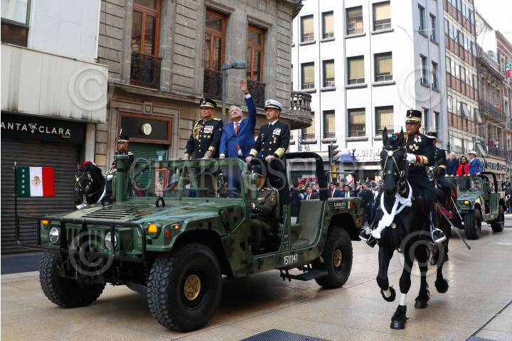 CIUDAD DE MÉXICO, 09FEBRERO2023.- Andrés Manuel López Obrador, presidente de México, acompañado por Beatriz Gutiérrez Müller, investigadora y primera dama, así como de: Luis Cresencio Sandoval, secretario de la Defensa Nacional; Rafael Ojeda, secretario de Marina; Alejandro Armenta Mier; presidente de la Mesa Directiva del Senado; Santiago Creel, presidente de la Mesa Directiva de Diputados, y Norma Lucía Piña Hernández, ministra presidenta de la Suprema Corte de Justicia de la Nación, acontecieron la representación de la Marcha de la Lealtad, hecho histórico en el que el presidente Francisco I. Madero entró hacia Palacio Nacional escoltado por cadetes del Heroico Colegio Militar en 1913. FOTO: PRESIDENCIA/CUARTOSCURO.COM