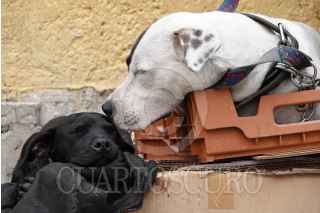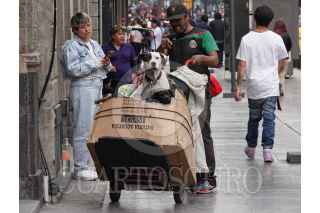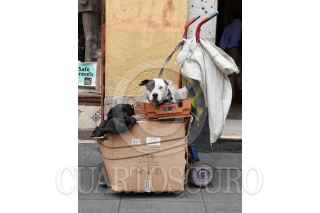 CIUDAD DE MÉXICO, 10FEBTERO2023.- Montadas en un diablo, las perritas "Nebulosa" y "Nube" son paseadas por su dueño Benito en las Calles del Centro Histórico. FOTO: GRACIELA LÓPEZ /CUARTOSCURO.COM