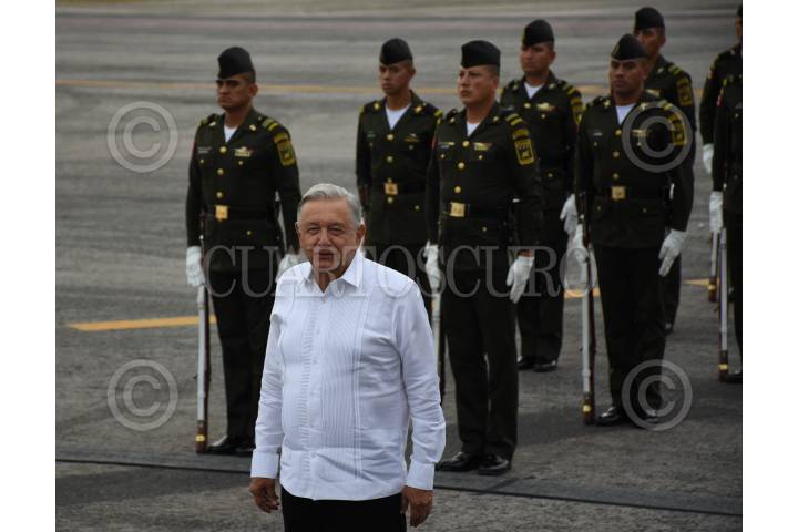 CAMPECHE, CAMPECHE, 11FEBRERO2023.- El Presidente Andrés Manuel López Obrador recibió al mandatario de Cuba Miguel Diaz-Canel en el Aeropuerto Internacional de Campeche, Ing. Alberto Acuña Ongay. El presidente cubano realiza su tercera visita a México y primera en Campeche. En la bienvenida estuvieron presentes: Layda Sansores San Román, Gobernadora de Campeche; Marcelo Ebrard Casaubon, secretario de Relaciones Exteriores; Adán Augusto López Hernández, secretario de Gobernación; Luis Cresencio Sandoval González, secretario de la Defensa Nacional; José Rafael Ojeda Durán, secretario de Marina; Miguel Díaz Reynoso, embajador de México en Cuba. FOTO: MICHAEL BALAM/CUARTOSCURO.COM
