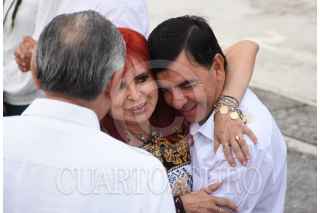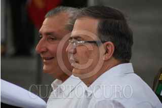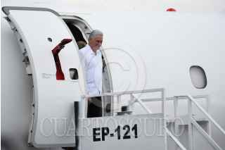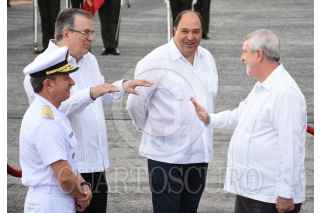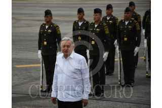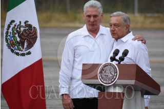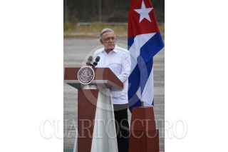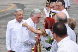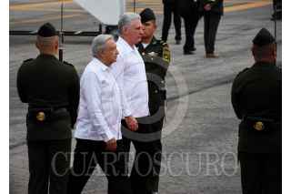 CAMPECHE, CAMPECHE, 11FEBRERO2023.- El Presidente Andrés Manuel López Obrador recibió al mandatario de Cuba Miguel Diaz-Canel en el Aeropuerto Internacional de Campeche, Ing. Alberto Acuña Ongay. El presidente cubano realiza su tercera visita a México y primera en Campeche. En la bienvenida estuvieron presentes: Layda Sansores San Román, Gobernadora de Campeche; Marcelo Ebrard Casaubon, secretario de Relaciones Exteriores; Adán Augusto López Hernández, secretario de Gobernación; Luis Cresencio Sandoval González, secretario de la Defensa Nacional; José Rafael Ojeda Durán, secretario de Marina; Miguel Díaz Reynoso, embajador de México en Cuba. FOTO: MICHAEL BALAM/CUARTOSCURO.COM
