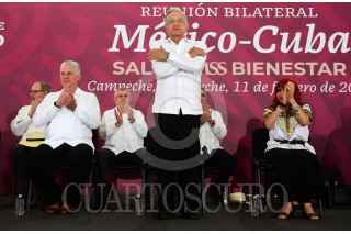 CAMPECHE, CAMPECHE, 11FEBRERO2023.- Andrés Manuel López Obrador, presidente de México, y Miguel Díaz-Canel Bermúdez, presidente de la República de Cuba, presidieron la Reunión Bilateral México - Cuba, Salud IMSS - Bienestar. Acompañados por: Lis Cuesta Peraza, esposa del presidente de la República de Cuba; Bruno Rodriguez Parrila, ministro de Relaciones Exteriores; Rodrigo Malmierca Díaz, ministro del Comercio Exterior y la Inversión Extranjera; José Ángel Portal Miranda, ministro de Salud Pública; Josefina de la Caridad Vidal Ferreiro, viceministra de Relaciones Exteriores; Eduardo Martínez Díaz, presidente de BioCubaFarma; Eugenio Martinez Enriquez, director general de América Latina y el Caribe del Ministerio de Relaciones Exteriores; Marcos Rodríguez Costa, embajador de Cuba en México; Layda Sansores San Román, gobernadora Constitucional del Estado de Campeche; Marcelo Ebrard Casaubon, secretario de Relaciones Exteriores; Zoé Robledo Aburto, director general del Instituto Mexicano del Seguro Social; Adán Augusto López Hernández, secretario de Gobernación; Maximiliano Reyes Zúñiga, subsecretario para América Latina y el Caribe; José Rafael Ojeda Durán, secretario de Marina; Lázaro Cárdenas Batel, coordinador de Asesores del presidente de la República; Luis Cresencio Sandoval González, secretario de la Defensa Nacional; Miguel Díaz Reynoso, embajador de México en Cuba; Jorge Alcocer Varela, secretario de Salud y Laura Elena Carrillo Cubillas, Directora Ejecutiva de Amexcid. FOTO: PRESIDENCIA/CUARTOSCURO.COM