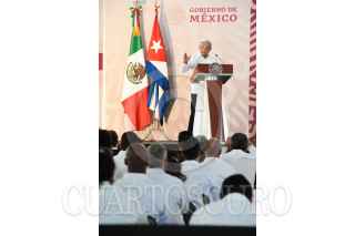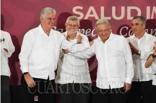 CAMPECHE, CAMPECHE, 11FEBRERO2023.- Los presidentes de Cuba Miguel Díaz–Canel Bermúdez y el presidente de México Andrés Manuel López Obrador sostuvieron una Reunión Bilateral México-Cuba con médicos del IMSS-Bienestar en la explanada de la Región Naval de Lerma en Campeche. En compañía de la gobernadora Layda Sansores, así como funcionarios del sector salud federal. FOTO: MICHAEL BALAM/CUARTOSCURO.COM