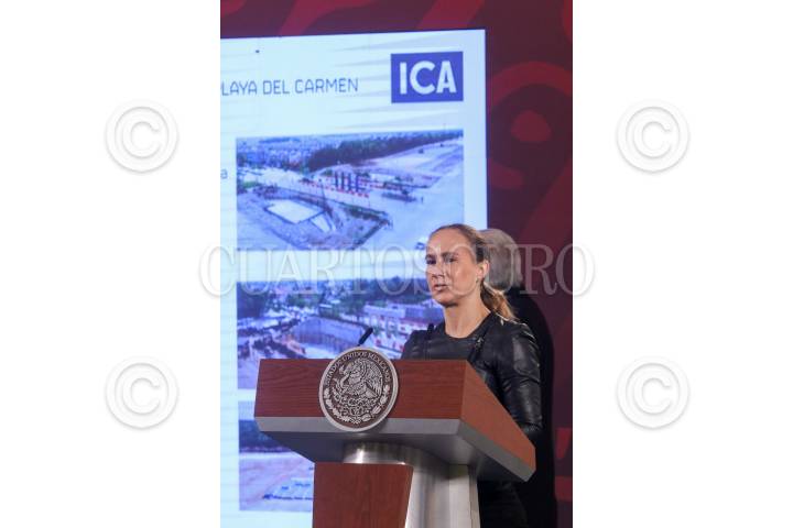 CIUDAD DE MÉXICO, 13FEBRERO2023.- Andrés Manuel López Obrador, Presidente de México; Ricardo Sheffield Padilla, titular de la Procuraduría Federal del Consumidor (Profeco); Marcelo Ebrard Casaubon, secretario de Relaciones Exteriores; Luis Cresencio Sandoval González, secretario de la Defensa Nacional; Javier May Rodríguez, director general del Fondo Nacional de Fomento al Turismo (Fonatur); João Pedro Parreira, presidente y director ejecutivo de Mota-Engil Latinoamérica; Manuel Muñozcano Castro, director general de Azvindi Ferroviario; Guadalupe Phillips Margain, directora general de Empresas ICA; Maite Ramos Gómez, directora de Alstom México; Diego Prieto Hernández, director general del Instituto Nacional de Antropología e Historia (INAH); María Luisa Albores González, secretaria de Medio Ambiente y Recursos Naturales, y María Elena Lezama Espinosa, gobernadora de Quintana Roo, durante la mañanera en la cual se dieron detalles de los avances del Tramo 5 del Tren Maya FOTO: MOISÉS PABLO/CUARTOSCURO.CON