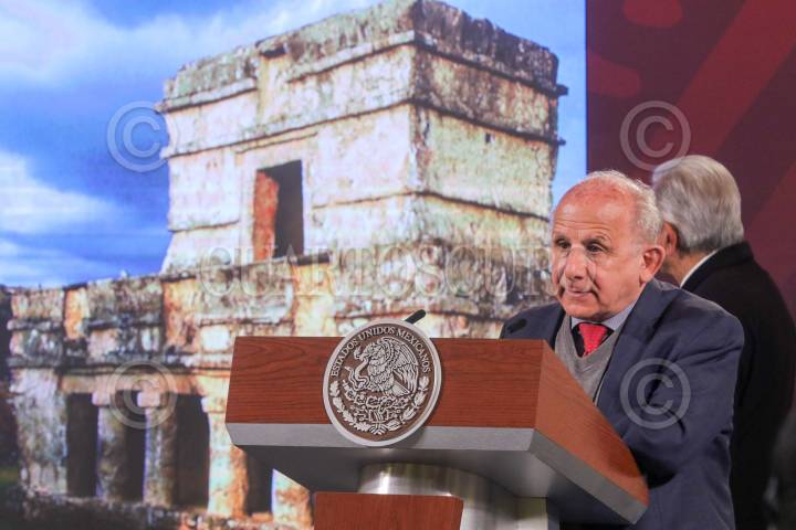 CIUDAD DE MÉXICO, 13FEBRERO2023.- Andrés Manuel López Obrador, Presidente de México; Ricardo Sheffield Padilla, titular de la Procuraduría Federal del Consumidor (Profeco); Marcelo Ebrard Casaubon, secretario de Relaciones Exteriores; Luis Cresencio Sandoval González, secretario de la Defensa Nacional; Javier May Rodríguez, director general del Fondo Nacional de Fomento al Turismo (Fonatur); João Pedro Parreira, presidente y director ejecutivo de Mota-Engil Latinoamérica; Manuel Muñozcano Castro, director general de Azvindi Ferroviario; Guadalupe Phillips Margain, directora general de Empresas ICA; Maite Ramos Gómez, directora de Alstom México; Diego Prieto Hernández, director general del Instituto Nacional de Antropología e Historia (INAH); María Luisa Albores González, secretaria de Medio Ambiente y Recursos Naturales, y María Elena Lezama Espinosa, gobernadora de Quintana Roo, durante la mañanera en la cual se dieron detalles de los avances del Tramo 5 del Tren Maya FOTO: MOISÉS PABLO/CUARTOSCURO.CON