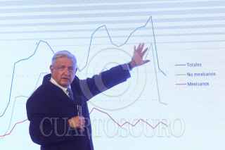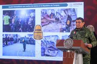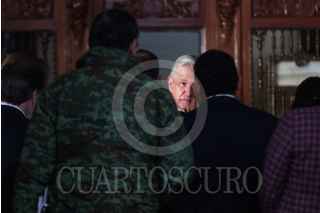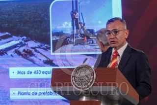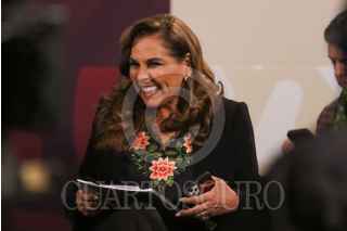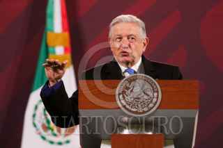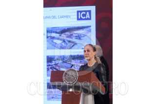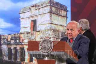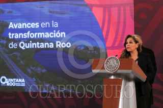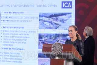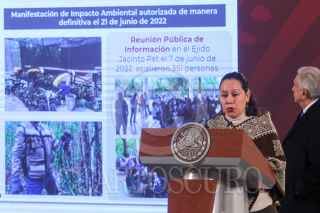 CIUDAD DE MÉXICO, 13FEBRERO2023.- Andrés Manuel López Obrador, Presidente de México; Ricardo Sheffield Padilla, titular de la Procuraduría Federal del Consumidor (Profeco); Marcelo Ebrard Casaubon, secretario de Relaciones Exteriores; Luis Cresencio Sandoval González, secretario de la Defensa Nacional; Javier May Rodríguez, director general del Fondo Nacional de Fomento al Turismo (Fonatur); João Pedro Parreira, presidente y director ejecutivo de Mota-Engil Latinoamérica; Manuel Muñozcano Castro, director general de Azvindi Ferroviario; Guadalupe Phillips Margain, directora general de Empresas ICA; Maite Ramos Gómez, directora de Alstom México; Diego Prieto Hernández, director general del Instituto Nacional de Antropología e Historia (INAH); María Luisa Albores González, secretaria de Medio Ambiente y Recursos Naturales, y María Elena Lezama Espinosa, gobernadora de Quintana Roo, durante la mañanera en la cual se dieron detalles de los avances del Tramo 5 del Tren Maya FOTO: MOISÉS PABLO/CUARTOSCURO.CON