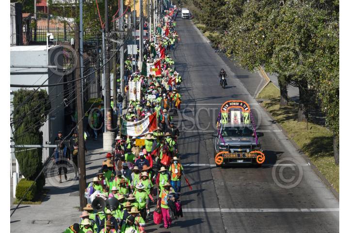 TOLUCA, ESTADO DE MÉXICO, 13FEBRERO2023.- Después de dos años se llevó de nueva cuenta la Peregrinación a Pie de la Arquidiócesis de Toluca rumbo a la Basílica de Guadalupe en su edición número 85, monseñor Raul Gómez González encabezó el contingente, con estandartes, imágenes de la Virgen de Guadalupe, Niño Dios los peregrinos avanzaron por las calles de Toluca, este día llegarán a Ocoyoacac en donde pernoctarán para mañana escuchar misa en la zona de La Marquesa y retomar su camino al Tepeyac. FOTO: CRISANTA ESPINOSA AGUILAR /CUARTOSCURO.COM