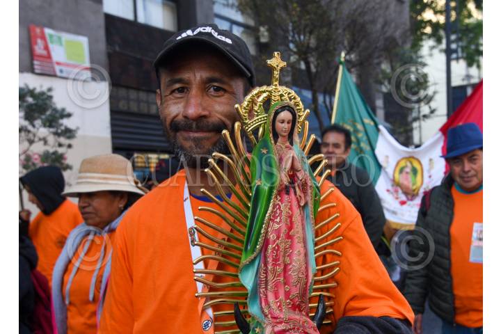 TOLUCA, ESTADO DE MÉXICO, 13FEBRERO2023.- Después de dos años se llevó de nueva cuenta la Peregrinación a Pie de la Arquidiócesis de Toluca rumbo a la Basílica de Guadalupe en su edición número 85, monseñor Raul Gómez González encabezó el contingente, con estandartes, imágenes de la Virgen de Guadalupe, Niño Dios los peregrinos avanzaron por las calles de Toluca, este día llegarán a Ocoyoacac en donde pernoctarán para mañana escuchar misa en la zona de La Marquesa y retomar su camino al Tepeyac. FOTO: CRISANTA ESPINOSA AGUILAR /CUARTOSCURO.COM