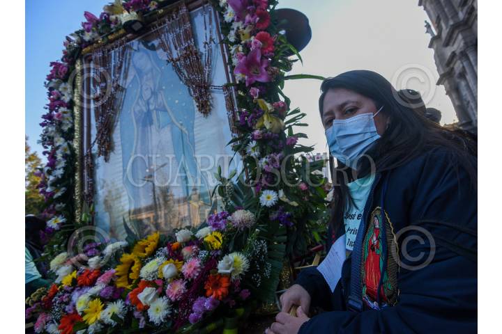 TOLUCA, ESTADO DE MÉXICO, 13FEBRERO2023.- Después de dos años se llevó de nueva cuenta la Peregrinación a Pie de la Arquidiócesis de Toluca rumbo a la Basílica de Guadalupe en su edición número 85, monseñor Raul Gómez González encabezó el contingente, con estandartes, imágenes de la Virgen de Guadalupe, Niño Dios los peregrinos avanzaron por las calles de Toluca, este día llegarán a Ocoyoacac en donde pernoctarán para mañana escuchar misa en la zona de La Marquesa y retomar su camino al Tepeyac. FOTO: CRISANTA ESPINOSA AGUILAR /CUARTOSCURO.COM