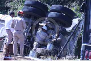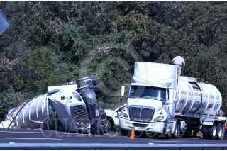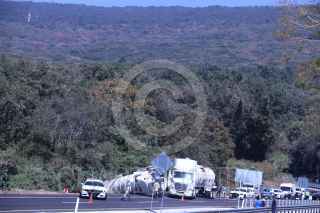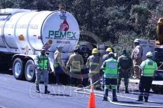 TEPOZTLÁN, MORELOS, 13FEBRERO2023.- Al amanecer de este día una pipa cargada de gasolina de Petróleos Mexicanos (PEMEX) volcó en el kilómetro 5 de la autopista La Pera-Cuautla.; afortunadamente no se registraron pérdidas humanas, el conductor de la pipa resultó ileso en el accidente y fue detenido para esclarecer el accidente. La vía no fue cerrada a la circulación ya que la pipa quedo fuera de la pista, personal de CAPUFE y de la Guardia Nacional apoyaron en el acordonamiento de la zona. También acudieron Bomberos del municipio para apoyar, finalmente llego una pipa y trabajadores especializados de PEMEX para iniciar el trasvase de la gasolina, el cual duro más de cuatro horas. FOTO: MARGARITO PÉREZ RETANA / CUARTOSCURO.COM