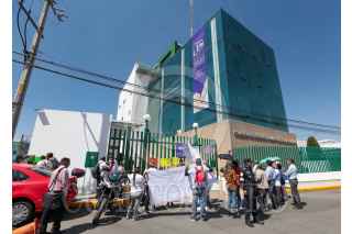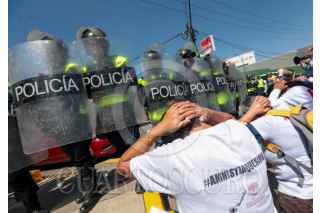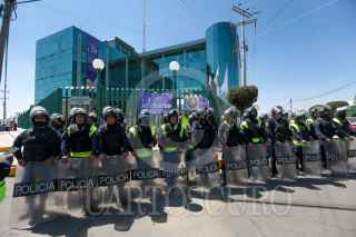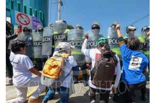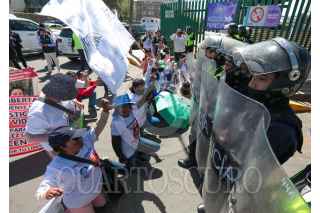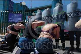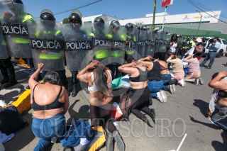 TOLUCA, ESTADO DE MÉXICO, 13FEBRERO2023.- Integrantes de “Haz Valer Mi Libertad” y la Caravana Mexiquense se manifestaron en las instalaciones de la Comisión de Derechos Humanos del Estado de México durante el 30 aniversario de esta dependencia, bajo las consignas “30 Años de la CODHEM y nada que celebrar” y “CODHEM no me defiende”, algunas mujeres se arrodillaron ante los policías estatales que resguardaban el inmueble y descubrieron su torso durante la protesta. FOTO: CRISANTA ESPINOSA AGUILAR /CUARTOSCURO.COM
