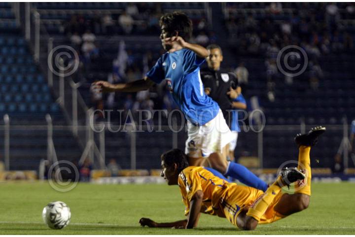 MÉXICO, D.F., 21MARZ0O2007.- Grabriel Pereyra, delantero del Cruz Azul, dribla a varios jugadores de los Tigres, durante el encuentro que disputaron en el Estadio Azul. FOTO: MOISÉS PABLO/CUARTOSCURO.COM