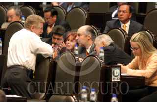MÉXICO, D.F., 22MARZO2007.- El coordinador del PRD, Javier González Garza platica con los diputados de Convergencia, Laida Sansores y Alejandro Chanona, durante la sesión en la Cámara de Diputados. FOTO: MOISÉS PABLO/CUARTOSCURO.COM