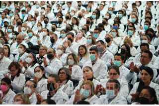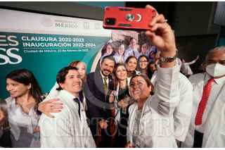 CIUDAD DE MÉXICO, 20FEBRERO2023.- Con el egreso de 5 mil 600 residentes (2 mil 715 mujeres y 2 mil 885 hombres), y la oferta de 10 mil 599 plazas para esta categoría, el Instituto Mexicano del Seguro Social (IMSS) tendrá a partir del próximo 1° de marzo – y para los siguientes años – las médicas y médicos especialistas que se necesitan, a fin de continuar el crecimiento en el Seguro Social para la atención de los derechohabientes, aseguró el director general Zoé Robledo. Al encabezar la Ceremonia de Clausura del Ciclo Académico 2022-2023 e inauguración del Ciclo Académico 2023-2024 de los Cursos de Especialización Médica ante mil residentes reunidos en la Unidad de Congresos del Centro Médico Nacional (CMN) Siglo XXI, Zoé Robledo señaló que en 2023 “tendremos la cifra récord de 24 mil 212 personas en formación”, y los 5 mil 600 nuevos especialistas que egresaron hoy del IMSS significan 41 por ciento más del inicio de la actual administración. FOTO: IMSS/CUARTOSCURO.COM