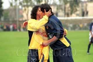 Esta mañana fue presentado el chileno Ivan "bam bam" Zamorano, como uno de los refuerzos de las Aguilas del América. En la foto, es calurosamente recibido por su compatriota Fabian Estay. FOTO: Eduardo Loza/CUARTOSCURO.COM