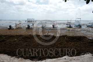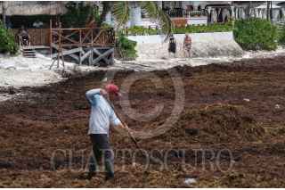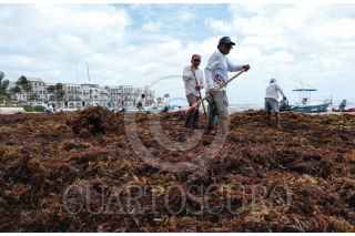 PLAYA DEL CARMEN, QUINTANA ROO, 03MARZO2023.- El sargazo, macroalga proveniente del océano Atlántico, comenzó su arribo masivo a la playa El Recodo en la entidad del Caribe Mexicano. Pobladores se dan a la tarea para retirarlo pues su presencia suele ser incómoda para los visitantes. FOTO: ELIZABETH RUIZ/CUARTOSCURO.COM
