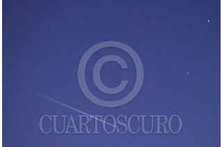 CUERNAVACA, MORELOS, 03MARZO2023.- Un jet deja su estela de vapor durante la tarde de este día en el cielo de la capital de Morelos. Arriba se puede ver la conjunción de los planetas Júpiter y el luminoso Venus. FOTO: MARGARITO PÉREZ RETANA/CUARTOSCURO.COM