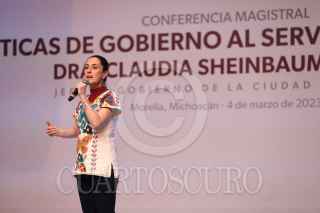 MORELIA, MICHOACÁN, 04MARZO2023.- Claudia Sheinbaum, jefa de gobierno de la Ciudad de México, encabezó la conferencia magistral Políticas del Gobierno al Servicio del Pueblo durante su gira por el estado de Michoacán. FOTO: GOBIERNO CDMX/CUARTOSCURO.COM