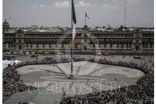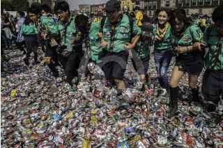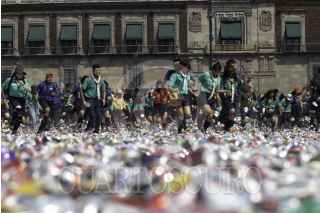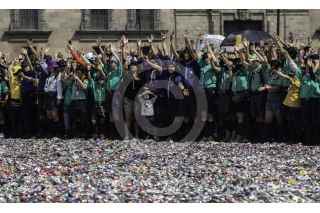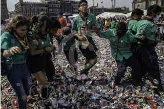 CIUDAD DE MÉXICO, 05MARZO2023.- Cientos de niños y adolescentes de distintos grupos de Scouts se reunió en el Zócalo Capitalino para armar una Flor de Loto y después venderlas para donar los recursos al Centro de Atención Integral de Labio y Paladar Hendido A.C. Al final destruyeron la flor pateando las latas y recolectandolas. FOTO: ANDREA MURCIA /CUARTOSCURO.COM
