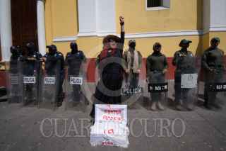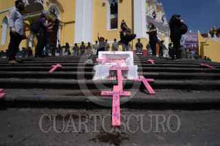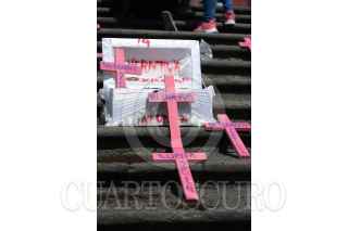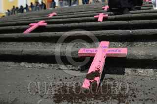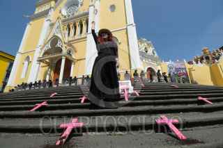XALAPA, VERACRUZ, 08MARZO2023.- La activista Wendy López realizó el performance “Las Sin Nombre”, colocó cruces rosas con nombres de mujeres víctimas de feminicidio. También cargó un ataúd frente a las policías que resguardan la entrada de la Catedral Metropolitana de Xalapa. FOTO: YERANIA ROLÓN/CUATOSCURO.COM