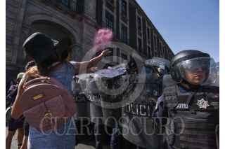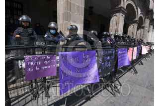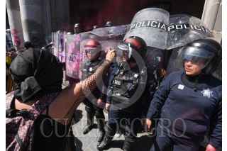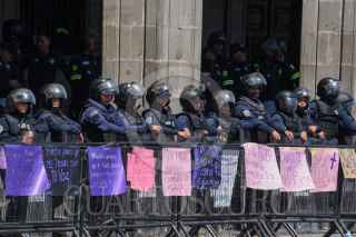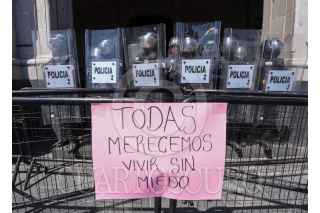 TOLUCA, ESTADO DE MÉXICO, 08MARZO2023.- Policías mujeres resguardaron Palacio de Gobierno durante las marchas que se dieron por el Día Internacional de la Mujer, algunas carteles fueron colocados en las vallas instaladas alrededor del edificio. FOTOS: CRISANTA ESPINOSA AGUILAR /CUARTOSCURO.COM