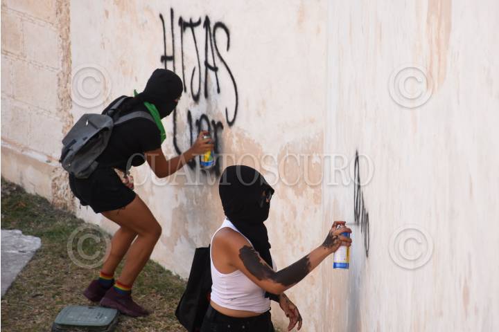 CAMPECHE, CAMPECHE 08MARZO2023.-Varios colectivos feministas realizaron la marcha con motivo del 8M en Campeche, recorrieron gran parte del centro histórico hasta llegar al palacio de gobierno, durante su trayecto realizaron pintas en las varias partes de las murallas y en el palacio de gobierno con consignas en favor de la protección de la mujer, el aborto y exigiendo justicia y respeto. FOTO: MICHAEL BALAM/CUARTOSCURO.COM