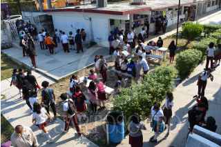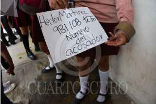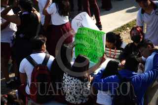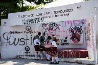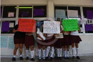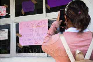 CAMPECHE, CAMPECHE, 13MARZO2023.- Alrededor de 40 Alumnas entre ellas menores de edad de la preparatoria Centro de Bachillerato y Tecnológico No.9 (CBTIS 9), se manifestaron en el plantel para denunciar a dos docentes por presunto acoso sexual, con pancartas tapizaron la dirección pidiendo ser escuchadas y exigiendo el cese de los docentes. La directora del plantel guardo silencio y se atrinchero en la dirección, padres de familia decidieron interponer denuncia colectiva ante la fiscalía del estado. FOTO: MICHAEL BALAM/CUARTOSCURO.COM