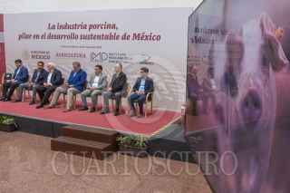 CIUDAD DE MÉXICO, 16MARZO2023.- El secretario de Agricultura y Desarrollo Rural, Víctor Villalobos Arámbula, inauguró el evento “La industria porcina, pilar en el desarrollo sustentable de México”, en el marco del Día Internacional del Cerdo, en donde destacó la colaboración y alianzas público-privadas para fortalecer la producción de carne de cerdo en el país. Acompañado de Heriberto Hernández Cárdenas, presidente de la Organización de Porcicultores Mexicanos (Opormex); Juan Cortina Gallardo, presidente del Consejo Nacional Agropecuario (CNA); María Elena Trujillo Ortega, presidente del Instituto Mexicano de la Porcicultura (IMP); entre otros funcionarios de organismos desconcentrados. FOTO: JUAN PABLO ZAMORA/CUARTOSCURO.COM