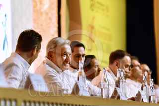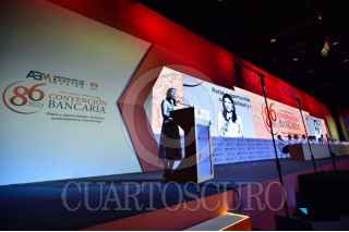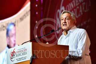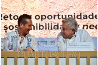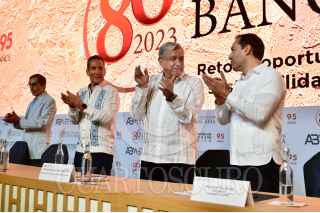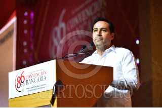 MÉRIDA, YUCATÁN, 16MARZO2023.-: Andrés Manuel López Obrador, Presidente de México; Rogelio Ramírez de la O, secretario de Hacienda; Mauricio Vila, gobernador de Yucatán; Daniel Becker, de la Asociación de Bancos de México; Victoria Rodríguez Ceja, gobernadora del Banco de México,y Gabriel Yorio, subsecretario de Hacienda, durante la inauguración de la 86 Convención Bancaria. FOTO: PRESIDENCIA/CUARTOSCURO.COM