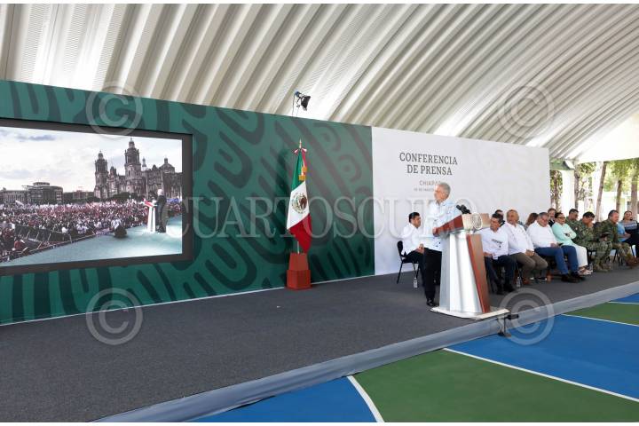 TUXTLA GUTIÉRREZ, CHIAPAS, 20MARZO2023.- Andrés Manuel López Obrador, Presidente Constitucional de los Estados Unidos Mexicanos, en conferencia de prensa matutina desde Chiapas. Lo acompañan Javier May Rodríguez, director general del Fondo Nacional de Fomento al Turismo; Rutilio Escandón Cadenas, gobernador Constitucional del Estado de Chiapas; Diego Prieto Hernández, director general del Instituto Nacional de Antropología e Historia; Carlos Manuel Merino Campos, gobernador Constitucional del Estado de Tabasco; Ricardo Sheffield Padilla, procurador Federal del Consumidor; Adán Augusto López Hernández, secretario de Gobernación; Luis Rodríguez Bucio, subsecretario de Seguridad; Rosa Icela Rodríguez Velázquez, secretaria de Seguridad y Protección Ciudadana; David Córdova Campos, comandante de la Guardia Nacional; Luis Cresencio Sandoval González, secretario de la Defensa Nacional; osé Rafael Ojeda, secretario de Marina; Ariadna Montiel Reyes, secretaria de Bienestar y María Luisa Albores González, secretaria de Medio Ambiente y Recursos Naturales. FOTO: PRESIDENCIA/CUARTOSCURO.COM