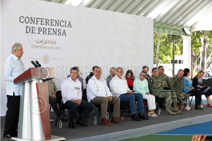 TUXTLA GUTIÉRREZ, CHIAPAS, 20MARZO2023.- Andrés Manuel López Obrador, Presidente Constitucional de los Estados Unidos Mexicanos, en conferencia de prensa matutina desde Chiapas. Lo acompañan Javier May Rodríguez, director general del Fondo Nacional de Fomento al Turismo; Rutilio Escandón Cadenas, gobernador Constitucional del Estado de Chiapas; Diego Prieto Hernández, director general del Instituto Nacional de Antropología e Historia; Carlos Manuel Merino Campos, gobernador Constitucional del Estado de Tabasco; Ricardo Sheffield Padilla, procurador Federal del Consumidor; Adán Augusto López Hernández, secretario de Gobernación; Luis Rodríguez Bucio, subsecretario de Seguridad; Rosa Icela Rodríguez Velázquez, secretaria de Seguridad y Protección Ciudadana; David Córdova Campos, comandante de la Guardia Nacional; Luis Cresencio Sandoval González, secretario de la Defensa Nacional; osé Rafael Ojeda, secretario de Marina; Ariadna Montiel Reyes, secretaria de Bienestar y María Luisa Albores González, secretaria de Medio Ambiente y Recursos Naturales. FOTO: PRESIDENCIA/CUARTOSCURO.COM
