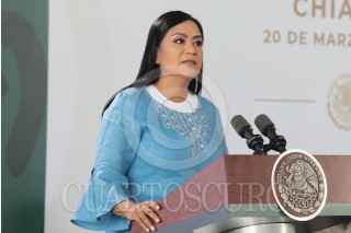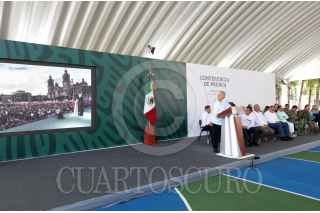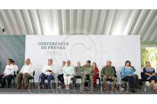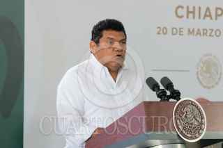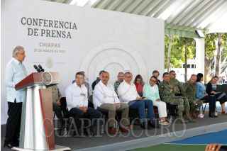 TUXTLA GUTIÉRREZ, CHIAPAS, 20MARZO2023.- Andrés Manuel López Obrador, Presidente Constitucional de los Estados Unidos Mexicanos, en conferencia de prensa matutina desde Chiapas. Lo acompañan Javier May Rodríguez, director general del Fondo Nacional de Fomento al Turismo; Rutilio Escandón Cadenas, gobernador Constitucional del Estado de Chiapas; Diego Prieto Hernández, director general del Instituto Nacional de Antropología e Historia; Carlos Manuel Merino Campos, gobernador Constitucional del Estado de Tabasco; Ricardo Sheffield Padilla, procurador Federal del Consumidor; Adán Augusto López Hernández, secretario de Gobernación; Luis Rodríguez Bucio, subsecretario de Seguridad; Rosa Icela Rodríguez Velázquez, secretaria de Seguridad y Protección Ciudadana; David Córdova Campos, comandante de la Guardia Nacional; Luis Cresencio Sandoval González, secretario de la Defensa Nacional; osé Rafael Ojeda, secretario de Marina; Ariadna Montiel Reyes, secretaria de Bienestar y María Luisa Albores González, secretaria de Medio Ambiente y Recursos Naturales. FOTO: PRESIDENCIA/CUARTOSCURO.COM