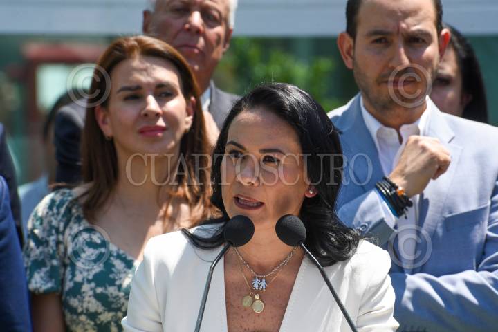 TOLUCA, ESTADO DE MÉXICO, 21MARZO2023.- Alejandra del Moral Vela después de realizar su registro candidatura para la gubernatura del periodo 2023-2029 por la Coalición Va por el Estado de México ofreció un mensaje en el patio del Instituto Electoral del Estado de México. FOTO: CRISANTA ESPINOSA AGUILAR /CUARTOSCURO.COM