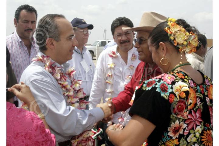 JUCHITÁN DE ZARAGOZA, OAXACA, 29MARZO2007.- Ulises Ruíz, gobernador de Oaxaca y Felipe Calderón Hinojosa, presidente de la República, pusieron en marcha la central Eolica La Venta II en la región del Itsmo. FOTO: CARLOS SALINAS/CUARTOSCURO.COM