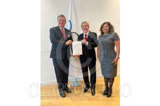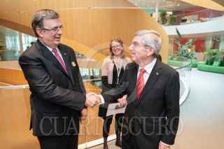 LAUSANA, SUIZA, 24MARZO2023.- El canciller Marcelo Ebrard y María José Alcalá, presidenta del Comité Olímpico Mexicano (COM), se reunieron hoy en Lausana, Suiza, sede del COI, con su presidente Thomas Bach, a quien entregaron una misiva en la que plantean, de manera formal, el interés de México en ser la sede de la próxima justa olímpica en 2036. FOTO: SRE/CUARTOSCURO.COM