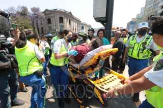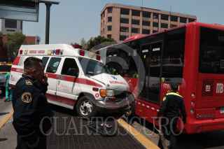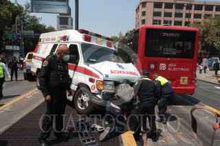 CIUDAD DE MÉXICO, 24MARZO2023.- Una ambulancia particular perdió el control y se estrelló contra un metrobus que pasaba sobre las avenidas Hidalgo y Rosales de la colonia Tabacalera. Dos paramédicos resultaron heridos. FOTO: ROGELIO MORALES/CUARTOSCURO.COM